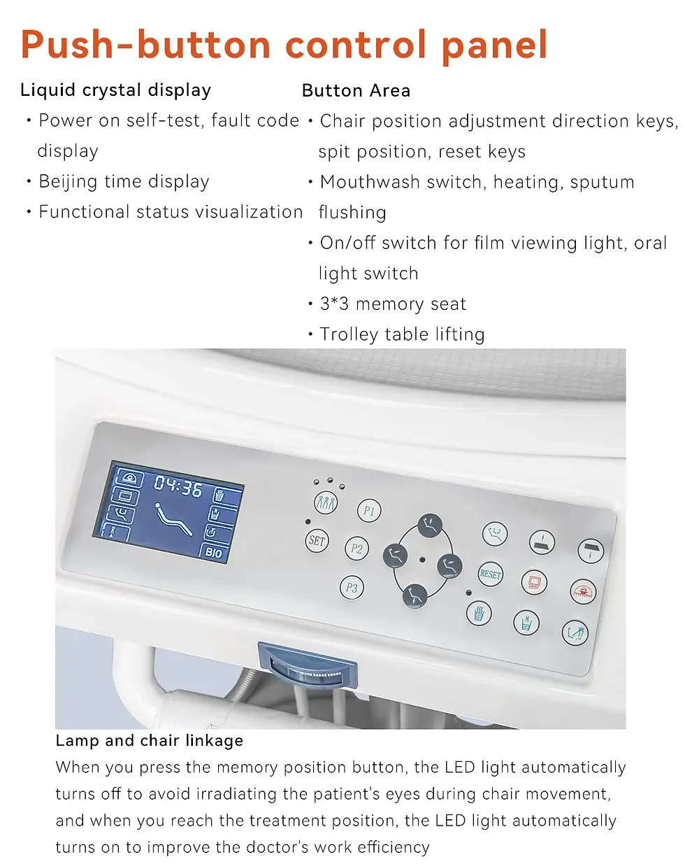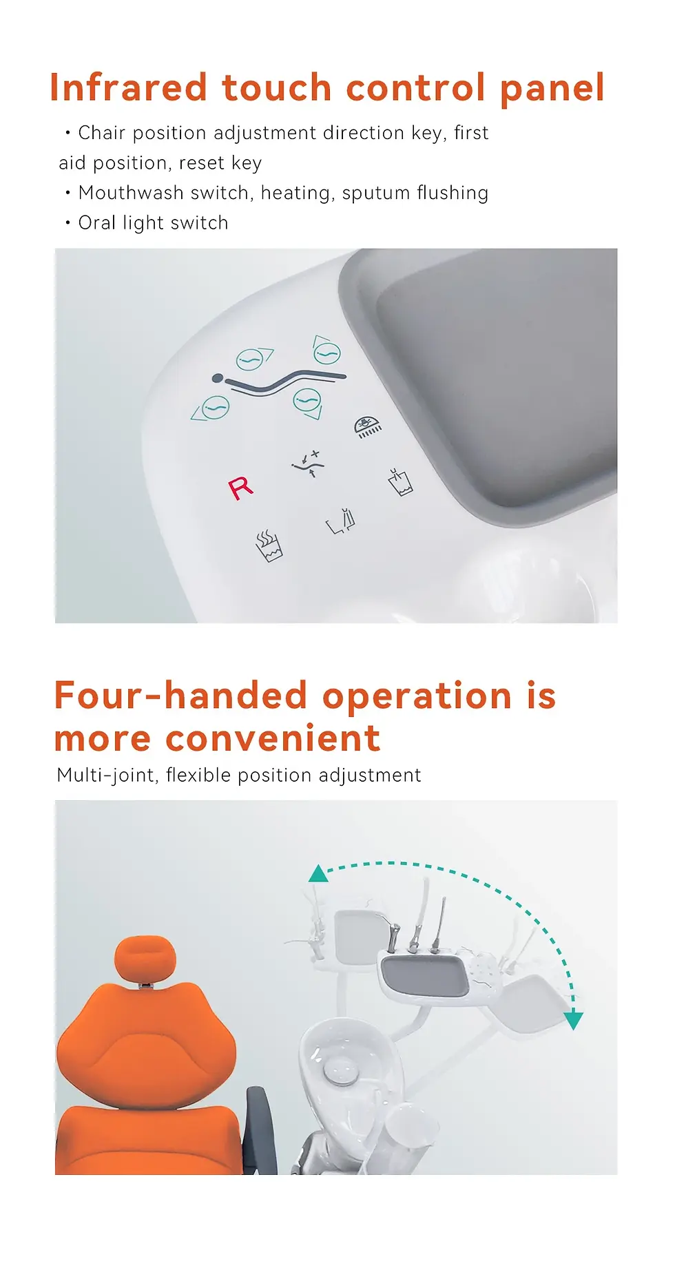 Longer & wider environmental leather cusion with 90 degree rotatable armrest, sit cushion & backrest with the one-button installation, even dentist can install. 3mm Die-cast aluminum for backrest support.